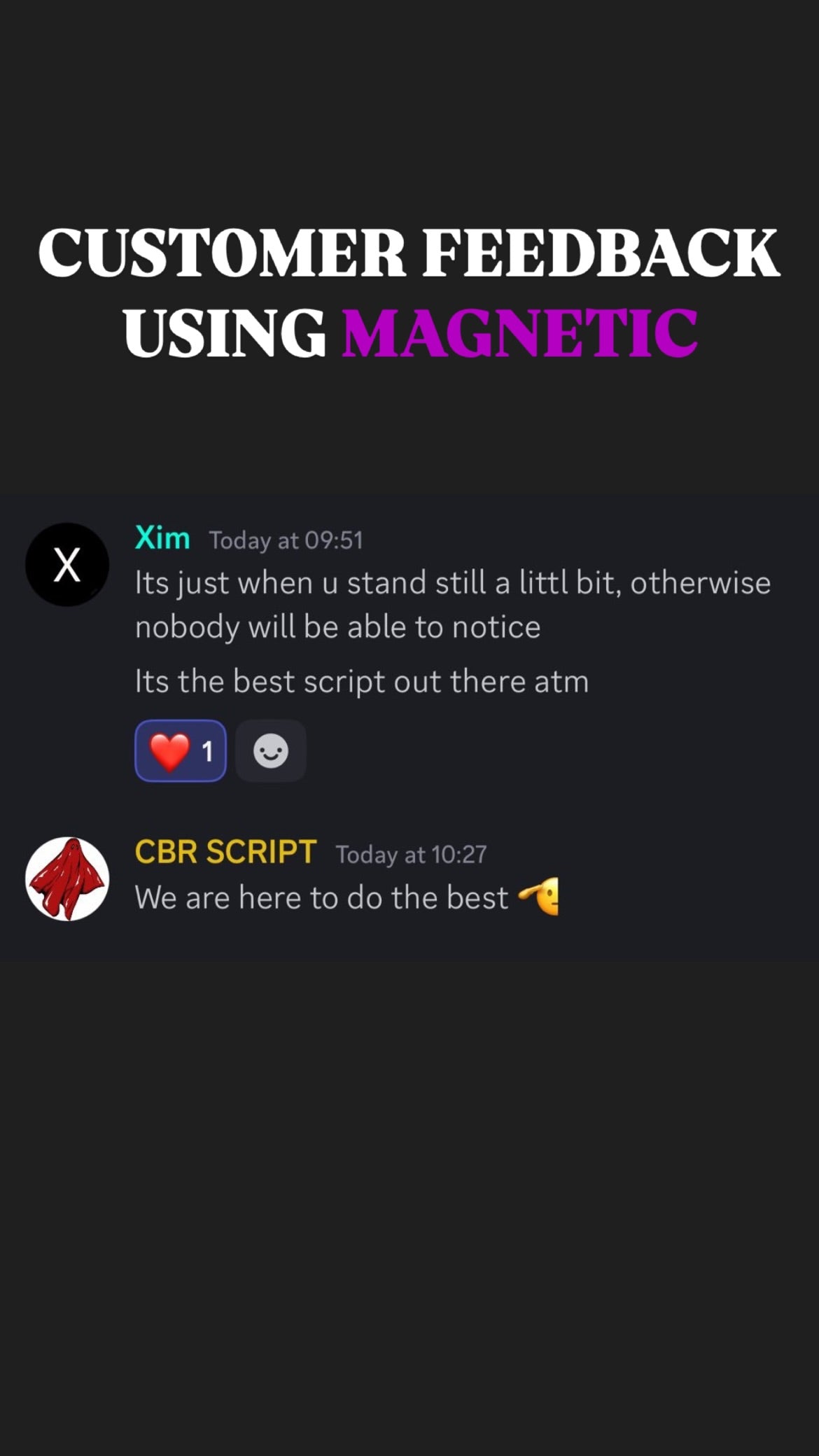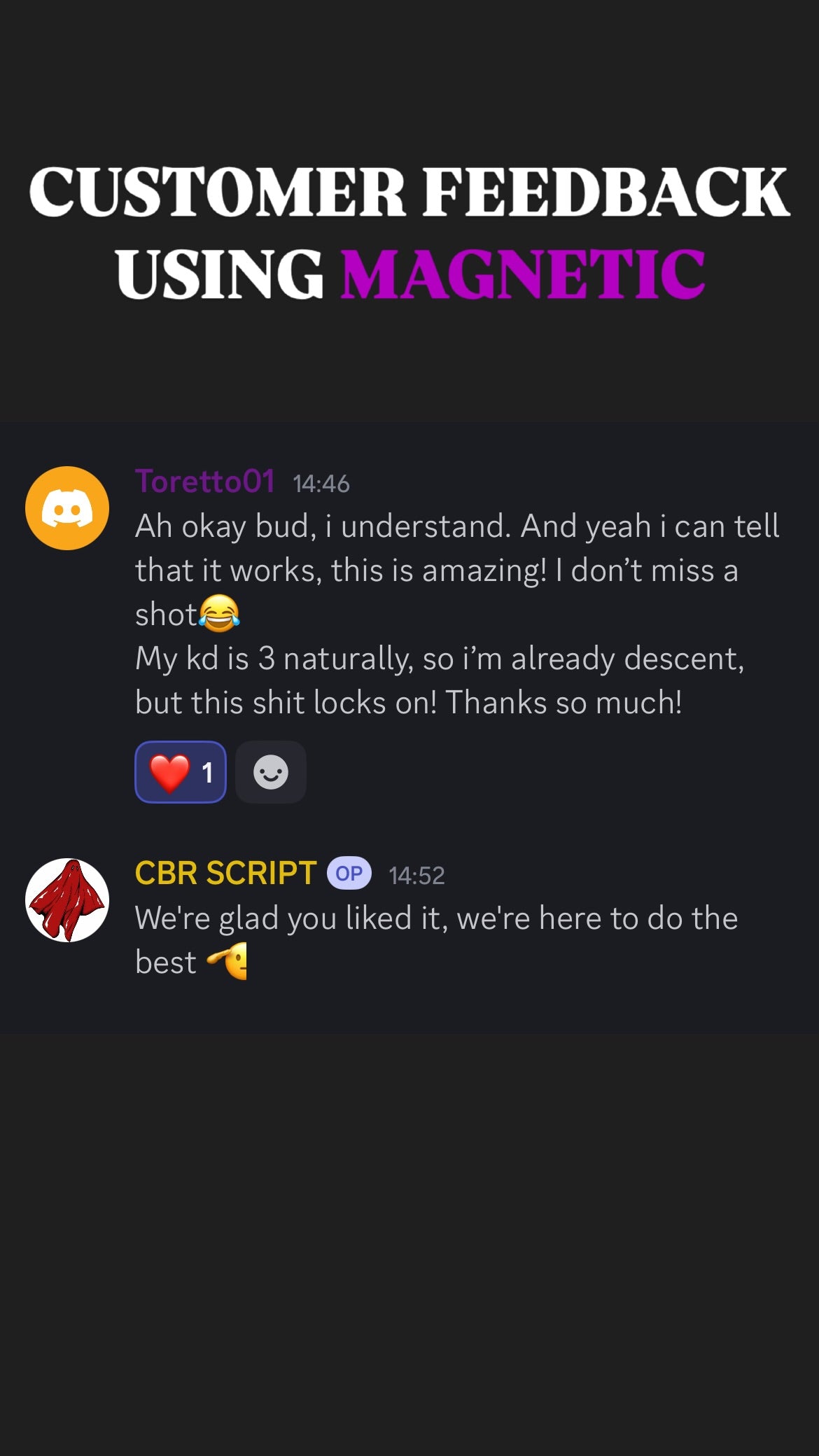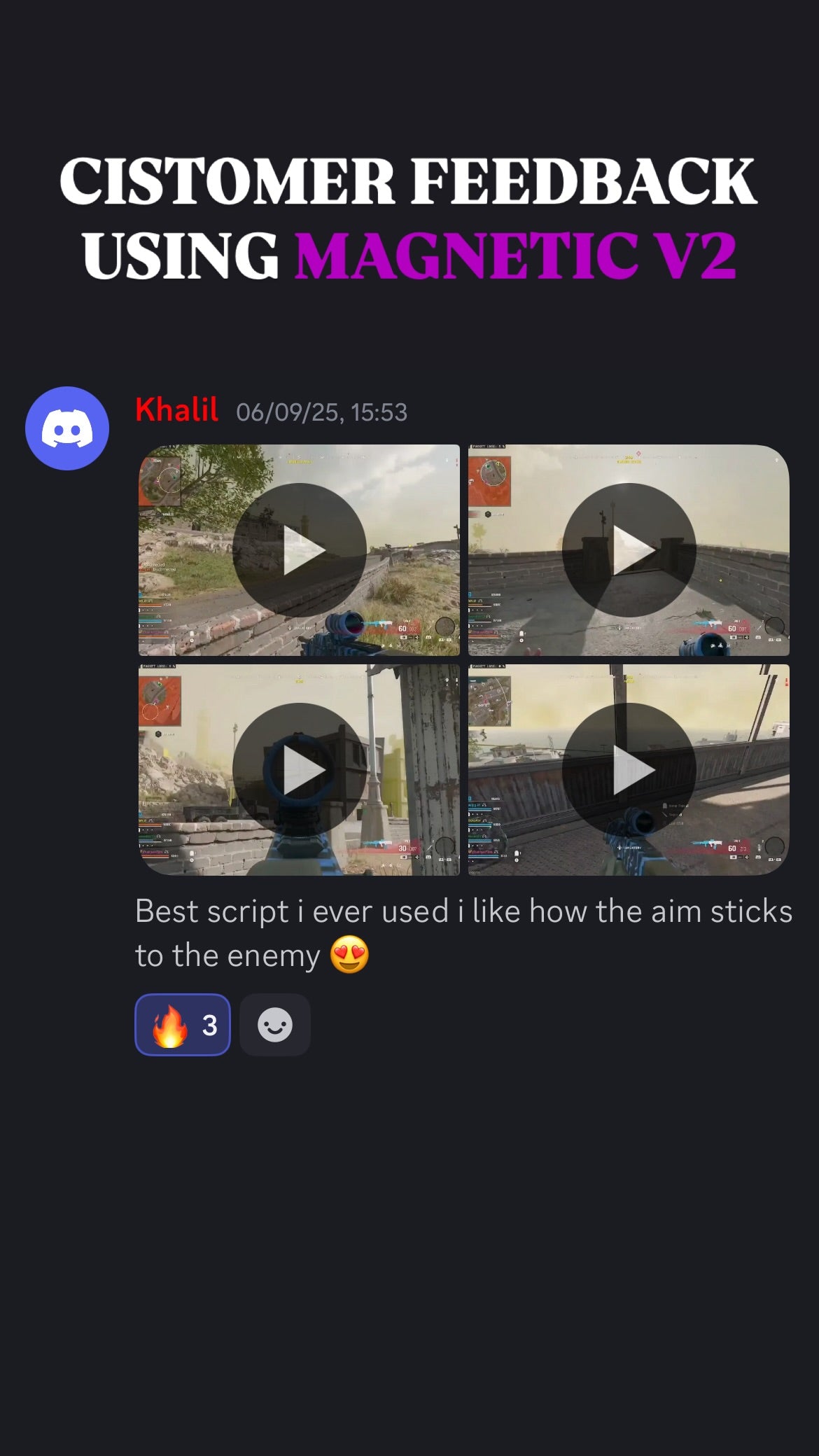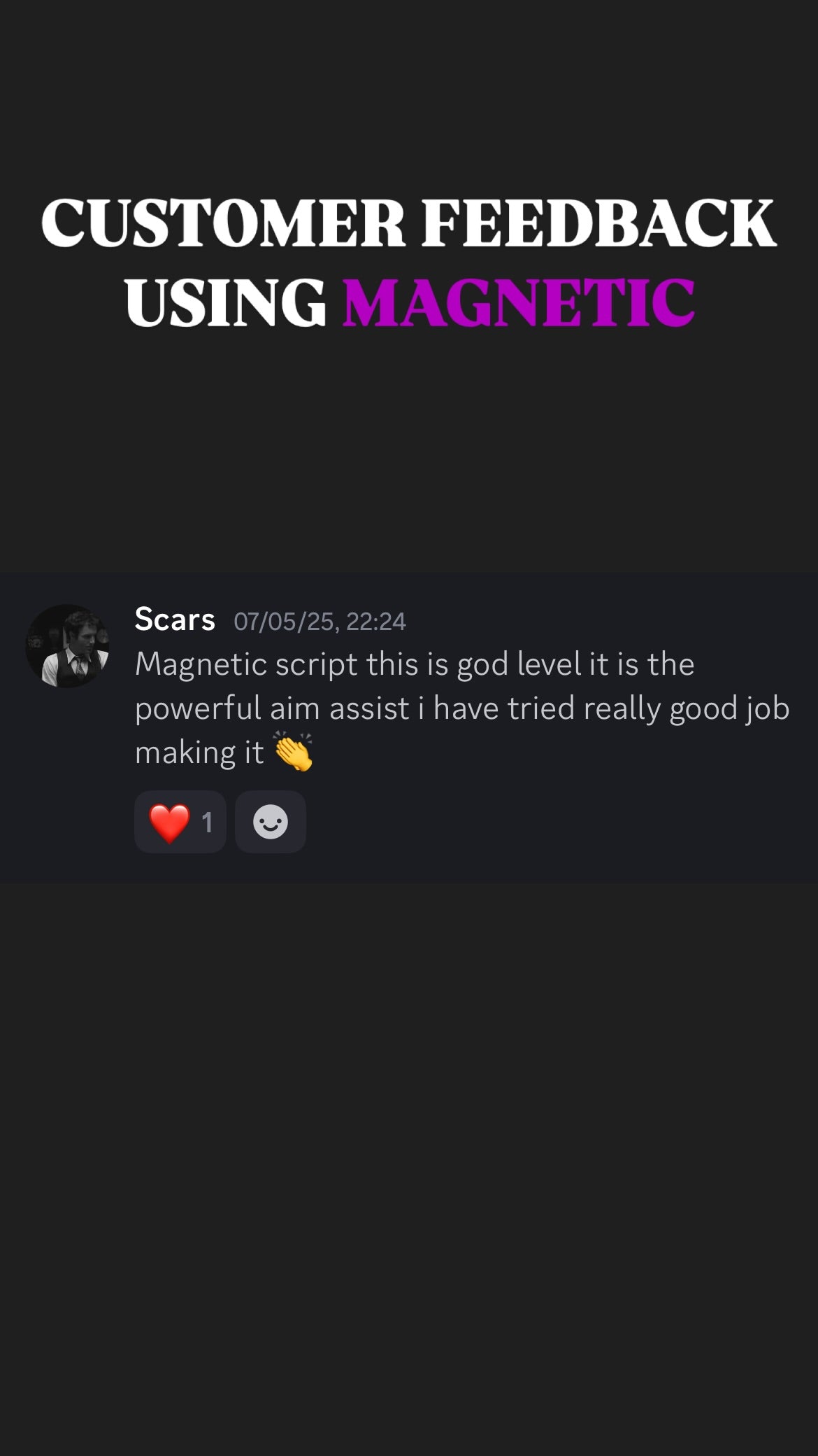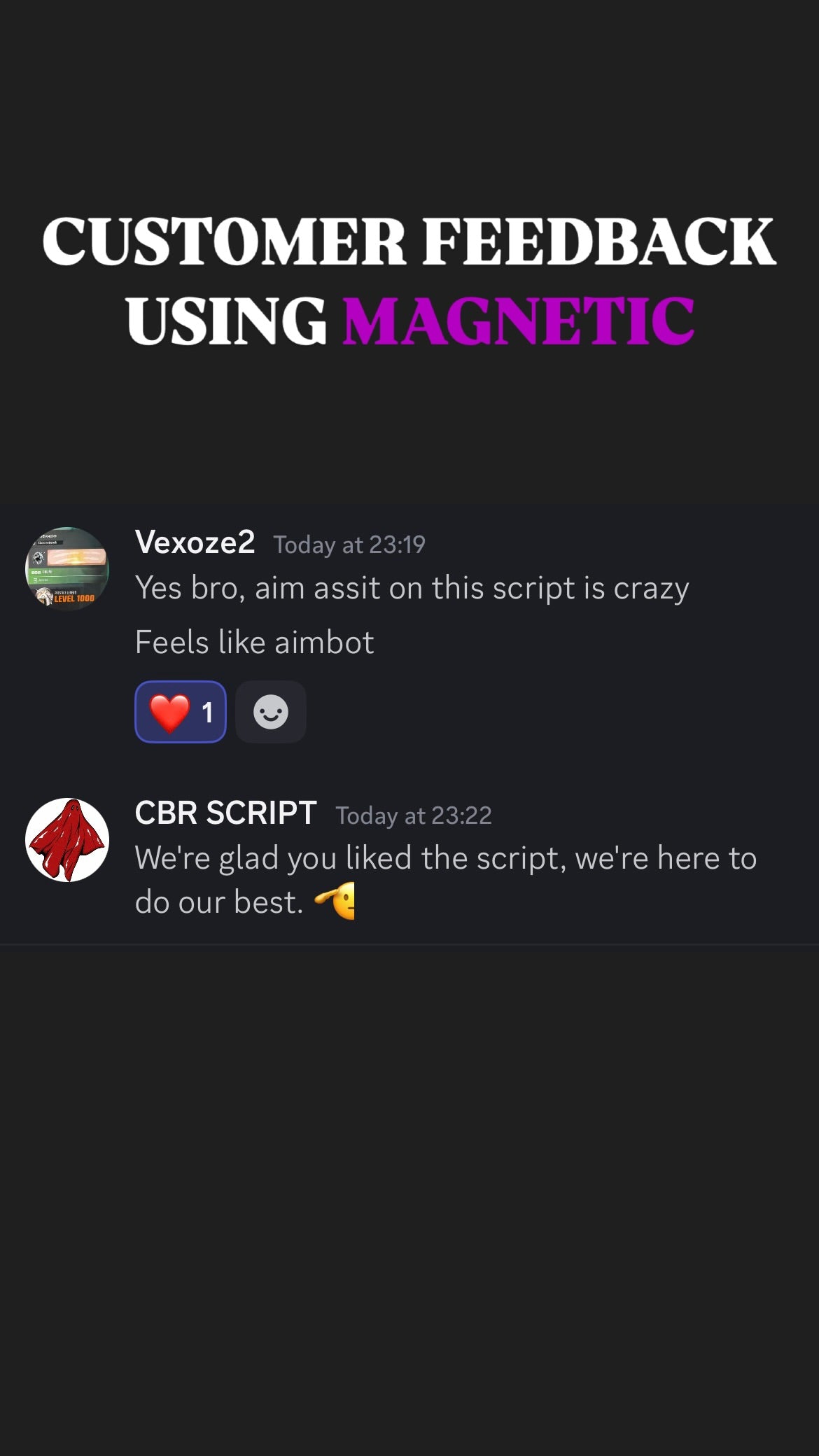 ๐ฅ When you get Magnetic Script With Support, you donโt just get the best aim assistโ you also join an exclusive community of like-minded players who share your passion for gaming excellence. Our Discord community is the perfect place to connect with other Magnetic Script users, share tips, and level up together!