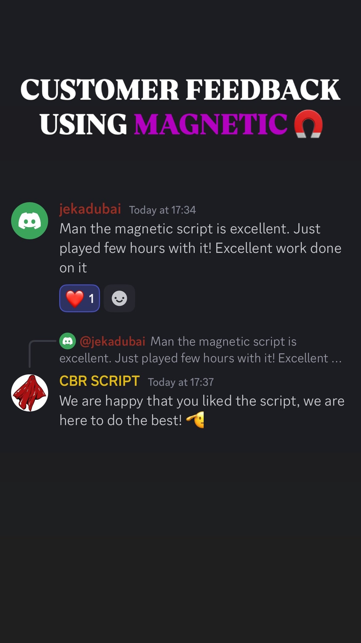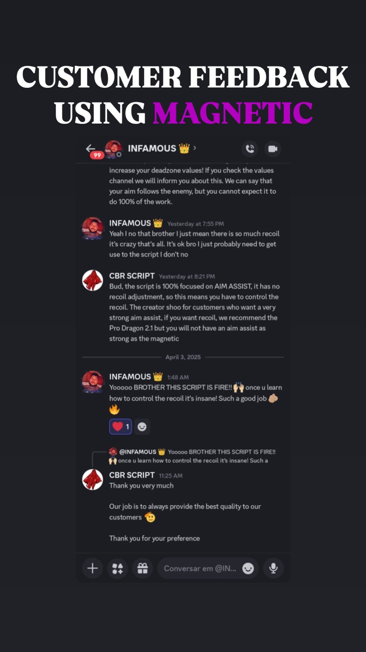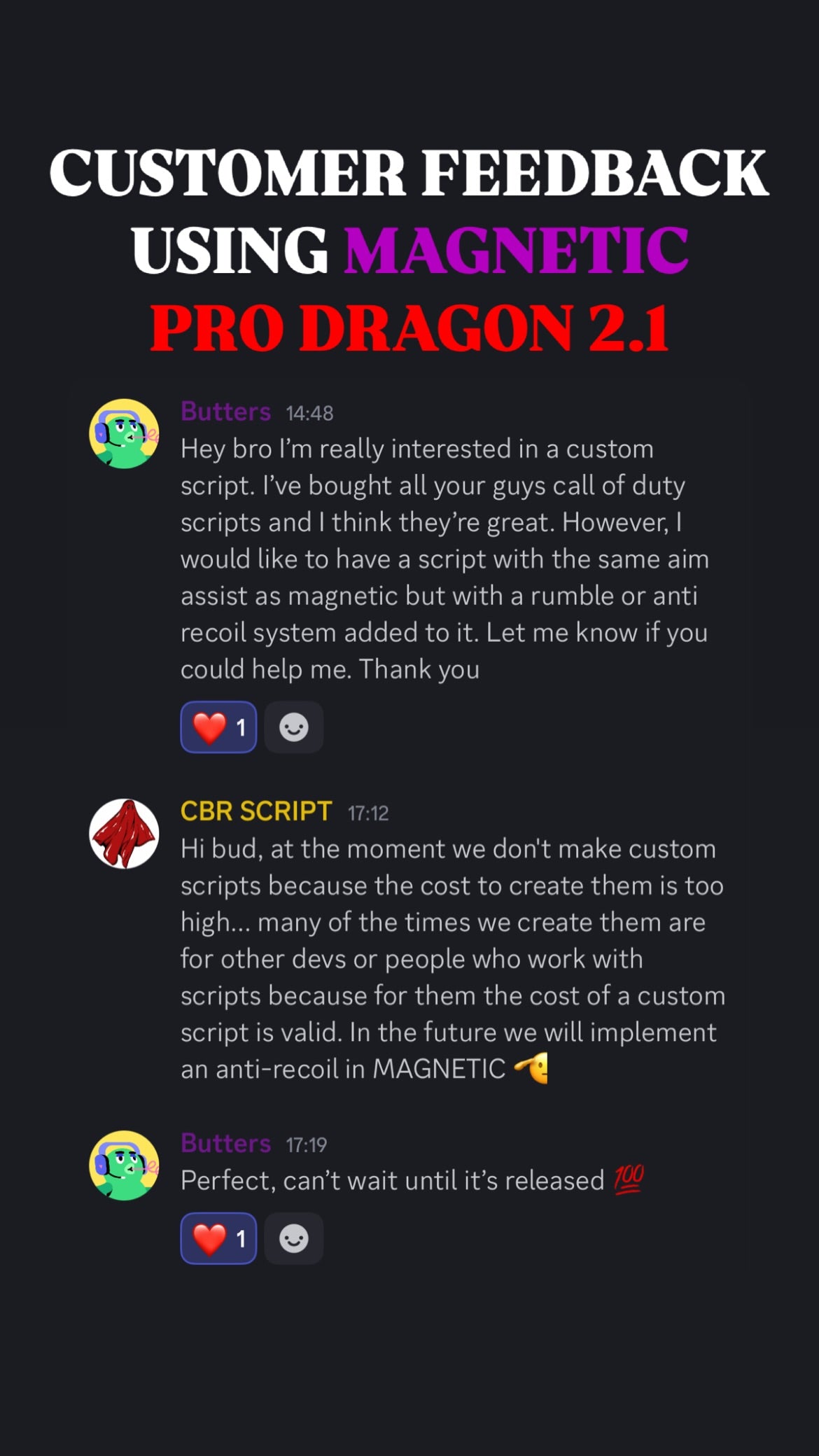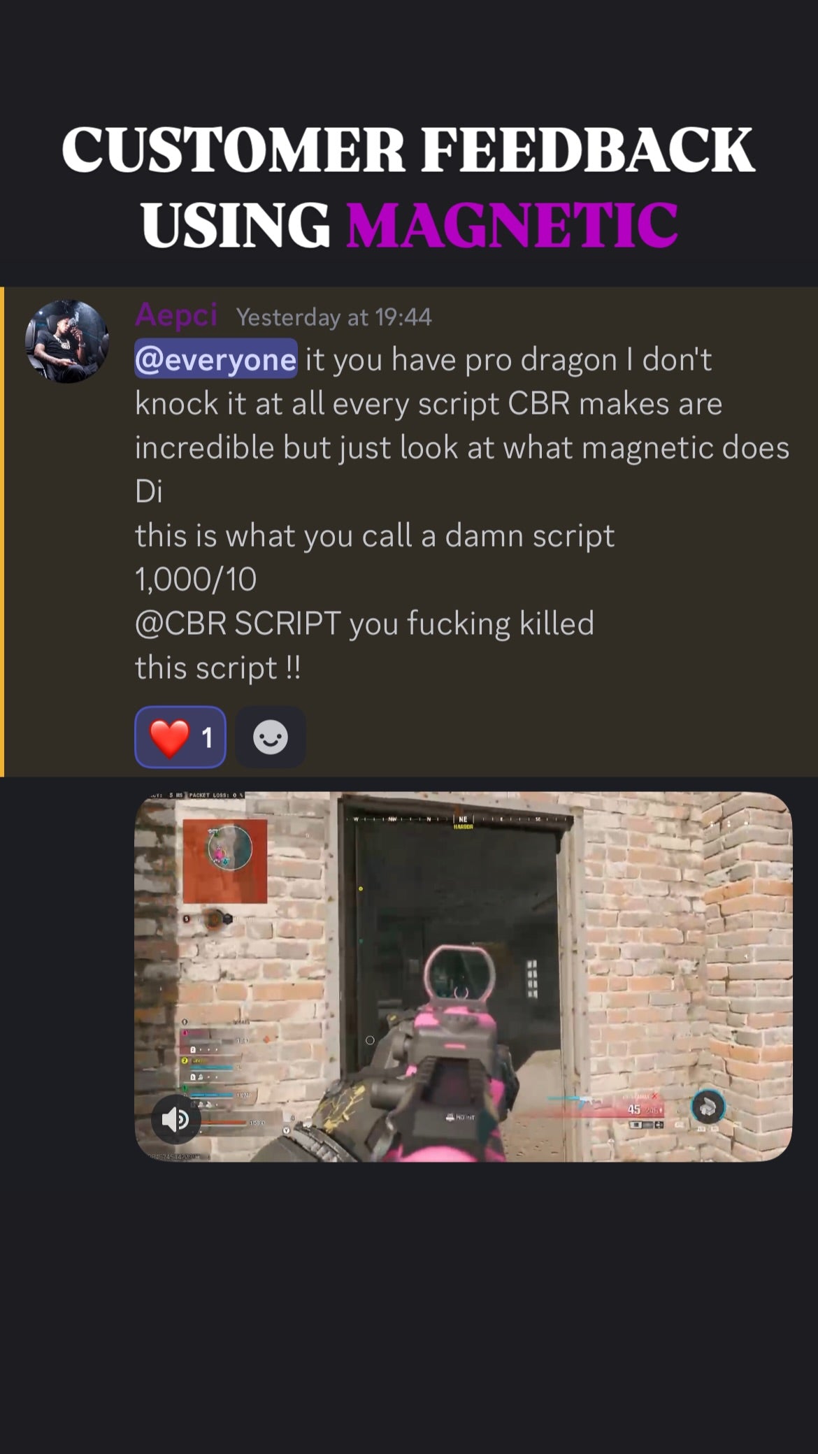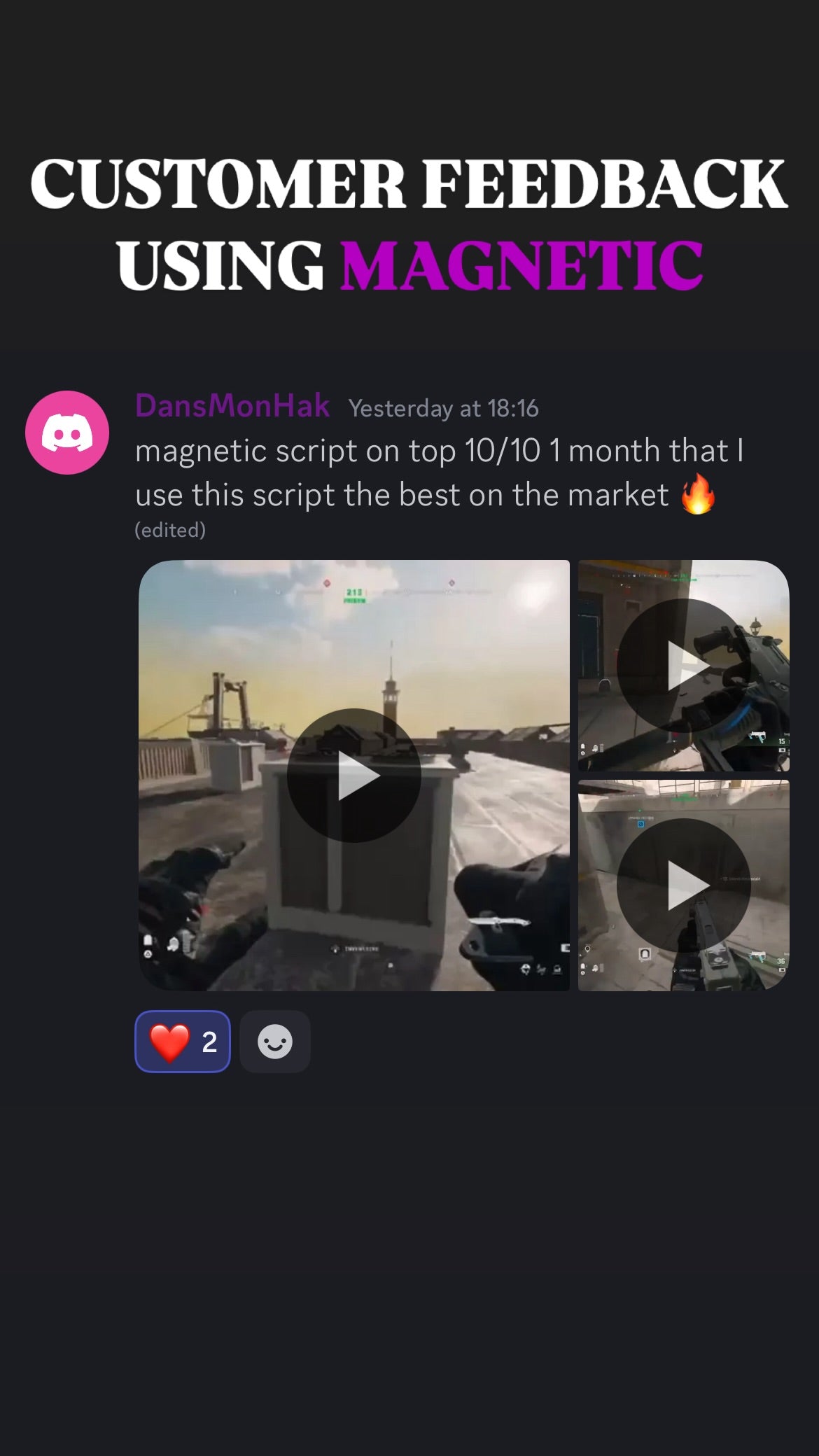 ๐ฅ When you get Magnetic Script With Support, you donโt just get the best aim assistโ you also join an exclusive community of like-minded players who share your passion for gaming excellence. Our Discord community is the perfect place to connect with other Magnetic Script users, share tips, and level up together!